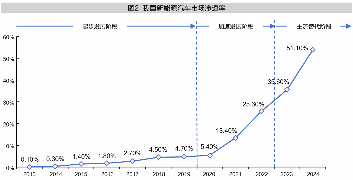 据有关统计数据显示,我国新能源汽车的市场渗透率从2013年的0.1%显著增长至2023年的35.6%,到2024年9月更跃升至51.10%(见图2)。这反映出该行业的发展已从初期起步阶段过渡到加速发展阶段,并进一步迈入主流替代阶段。据中国汽车工业协会数据显示,2024年前10个月传统燃油车的销售量为904.6万辆,较去年同期减少20.5%。同时,2024年1—9月,新能源汽车国内销量739.2万辆,同比增长35.6%。这一变化表明传统燃油车在我国的需求正在逐渐减弱。随着性价比日益提升,消费者接受程度不断提高,新能源汽车已经开始逐渐替代传统燃油车,成为国内汽车市场的主流选择之一。