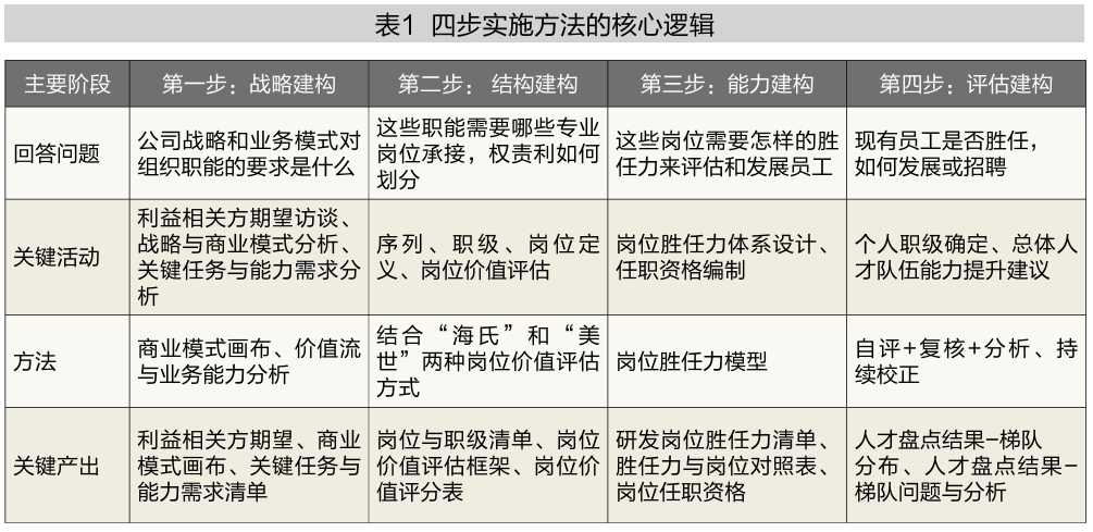 在明确战略型人才的核心特质与评估难题后,如何将理论转化为可操作的实践路径,成为破解“战略与执行脱节”的关键。基于前文对战略型人才的定义及胜任力模型的构建,本文提出一套四步实施方法(见表1),以“战略—结构—能力—评估”为逻辑主线,推动企业实现人才管理与企业战略的同频共振。