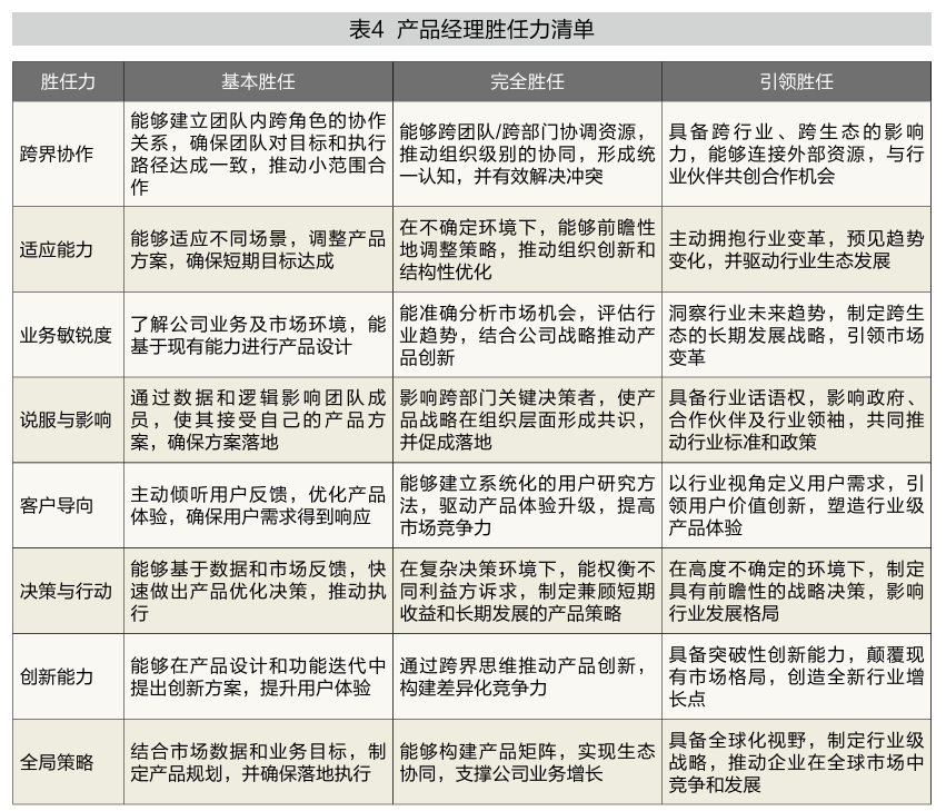 在企业通用胜任力模型的基础上,可针对各个角色制定相对应的胜任力清单。以产品经理岗位为例,其胜任力模型可涵盖业务敏感度、跨界协作、全局策略等核心能力,并设定“基本胜任—完全胜任—引领胜任”三级行为标准。例如,跨界协作能力在基本胜任阶段要求“协调小范围跨团队合作”,而在引领胜任阶段则需“主导跨行业生态共建”(见表4)。