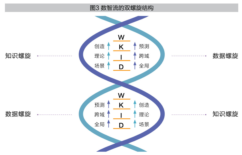 数智流以信息学的科学内涵为支撑。数智流具有双螺旋结构,包括数据螺旋和知识螺旋(见图3)。沿着DIKW体系,从数据螺旋可以看到:从单点数据到全局数据,实现了从数据到信息的演变;从单领域到跨领域信息,实现了从信息到知识的归纳;从已有知识延伸到预测未来,实现了从知识到智慧的跃迁。从知识螺旋可以看到:从数据到信息,需要加入对业务场景的认知;从信息到知识,需要理论作指导;从知识到智慧,需要创造引领。因此,企业在实现数智流的过程中,应当遵循“三个联系”——将全局信息与业务场景相联系,将理论知识与多领域相联系,将已有知识与未来预测相联系,基于数智流的双螺旋结构,重构核心业务模式,实现从数据要素到数据资产的转变,实现企业数据价值创造。