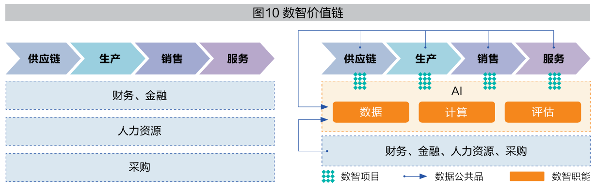 数智价值链就是在波特提出的经典价值链(见图10左)基础上增加一个数智活动(见图10右)。“数”指企业在运行过程中产生的大数据,“智”指人工智能等分析技术。在数字经济时代,数智活动将成为企业价值链必不可少的价值增值活动,成为企业价值链中的关键一环。总体来看,数智价值链中的数智活动具有三个职能。