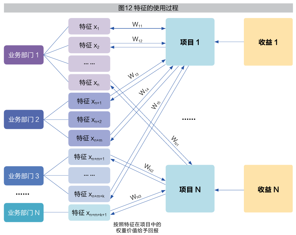 机器学习为衡量各个部门的数据绩效、促进企业内部市场化提供了解决方案。机器学习通常使用一些特征描述样本属性,并以特征权重反映特征对目标变量的影响程度,以此衡量特征的重要性。如图12所示,实施项目1的过程中,使用了5个特征,其中,业务部门1提供两个特征,业务部门2提供两个特征,业务部门3提供一个特征。项目1为企业带来经济收益后,将计算每个特征在项目中的重要性,并按照特征在项目中的权重价值给予回报。