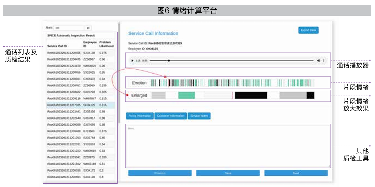 智慧。为将知识转化为可用于实践的管理工具,研究团队搭建了情绪计算平台(见图6),计算客户在服务过程中的情绪变化,基于客户情绪变化预测服务质量。通过对原有质检业务进行智能化升级和改造,质检部门可以优先调听平台监测到的存在负面情绪的通话录音。相比原先的人工质检方式,数智赋能让该公司的质检效率提高了十倍。