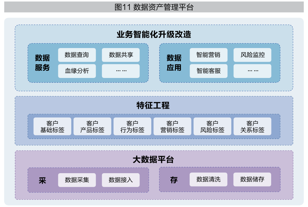 构建数据资产管理平台,首先要采集数据并对其进行加工、特征提取,然后分门别类地入仓,之后根据实际的业务场景进行数据建模,获取各类数据服务(含数据应用平台),加速对业务的赋能(见图11)。