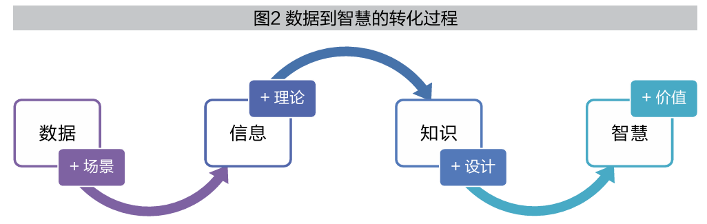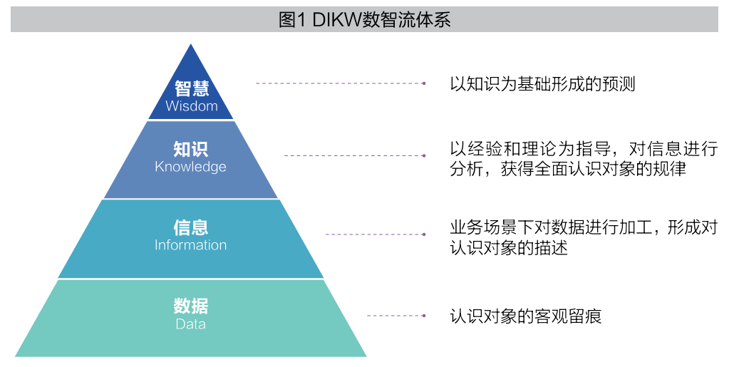 DIKW体系中,数据、信息、知识与智慧之间既有联系,又有区别(见图2)。数据是DIKW体系中最基础的一个概念,它是认识对象的客观留痕,是形成数据资产的最原始的素材。信息是有一定含义的、经过加工处理的、对决策有价值的数据,企业在业务场景下对原始数据进行加工处理形成的指标、特征、标签等,都可以称为信息。知识是在理论的指导下,通过智能化模型等提炼不同维度信息之间的关联获得的规律性认知。智慧是以知识为基础的正确的判断能力,关注的是对未来的预测。从采集数据、提炼关联信息、发现新规律、研究出新理论到创造新的知识或技术,是数据与实体二者不断迭代演进、归纳演绎形成普适智慧的过程。