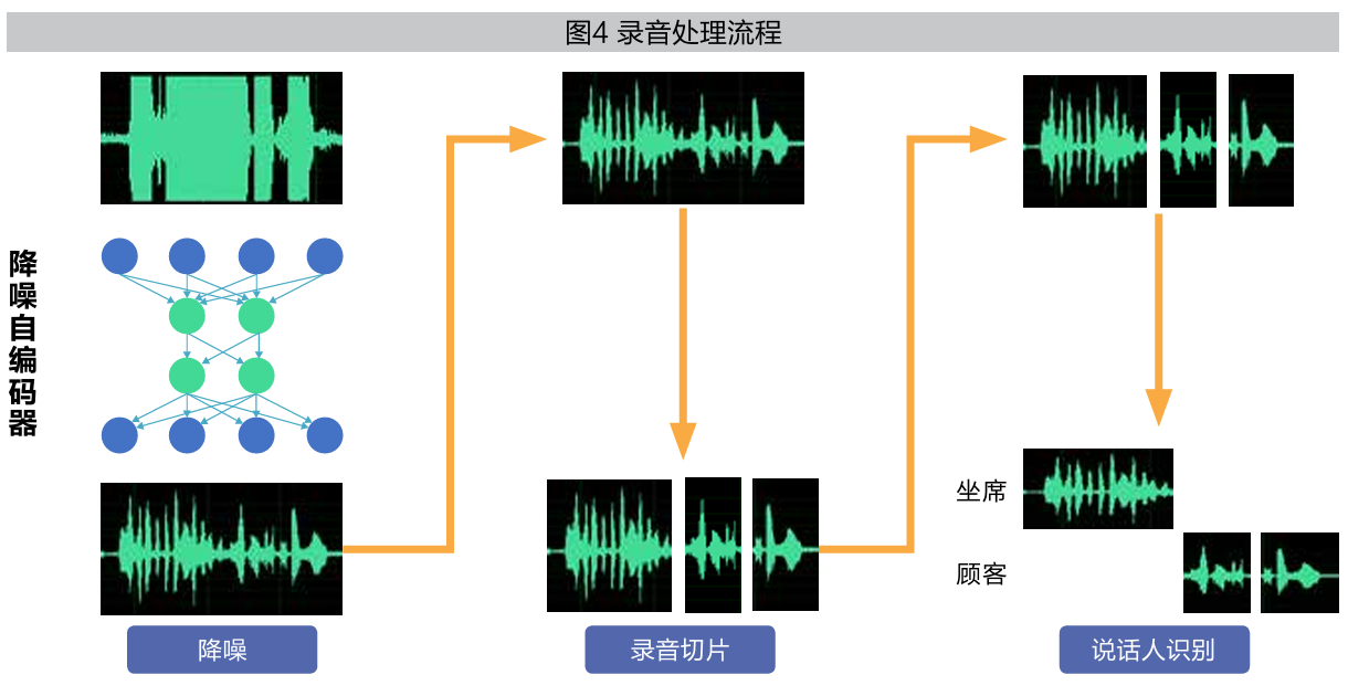 从数据到信息(对场景的描述)。在保险业务场景下,如果客户服务不好,就会降低客户满意度,进而影响客户留存。因此,客服质检是该保险公司的一个重要场景。高效精准的客服质检,不仅有助于提升服务质量,还能帮助企业在竞争激烈的市场环境中获取竞争优势,开拓新的市场份额。传统质检方式以人工手段(包括随机抽样质检和事后回访)为主,存在耗时长、结果延迟、人工成本高、样本规模小(只能完成所有通话记录的2%)、覆盖率低等问题。所以,该保险公司考虑以智能化方式升级和改造质检项目,提升质检效率。在该场景下,研究团队首先对2700通原始服务通话数据(超八千小时)进行数据降噪、录音切片、说话人识别等处理(见图4)。然后,给切片后的语音片段打上情绪标签,作为训练数据。通过CNN训练模型,判断出客户在一通服务通话中的情绪变化(见图5)。通过对非结构化原始数据的加工处理,形成对决策有价值的情绪数据即信息。