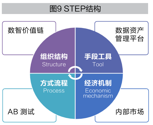 对于构建数智流过程中的挑战,可以从STEP四个维度来应对,即组织结构(Structure)、手段工具(Tool)、经济机制(Economic mechanism)、方式流程(Process)(见图9)。