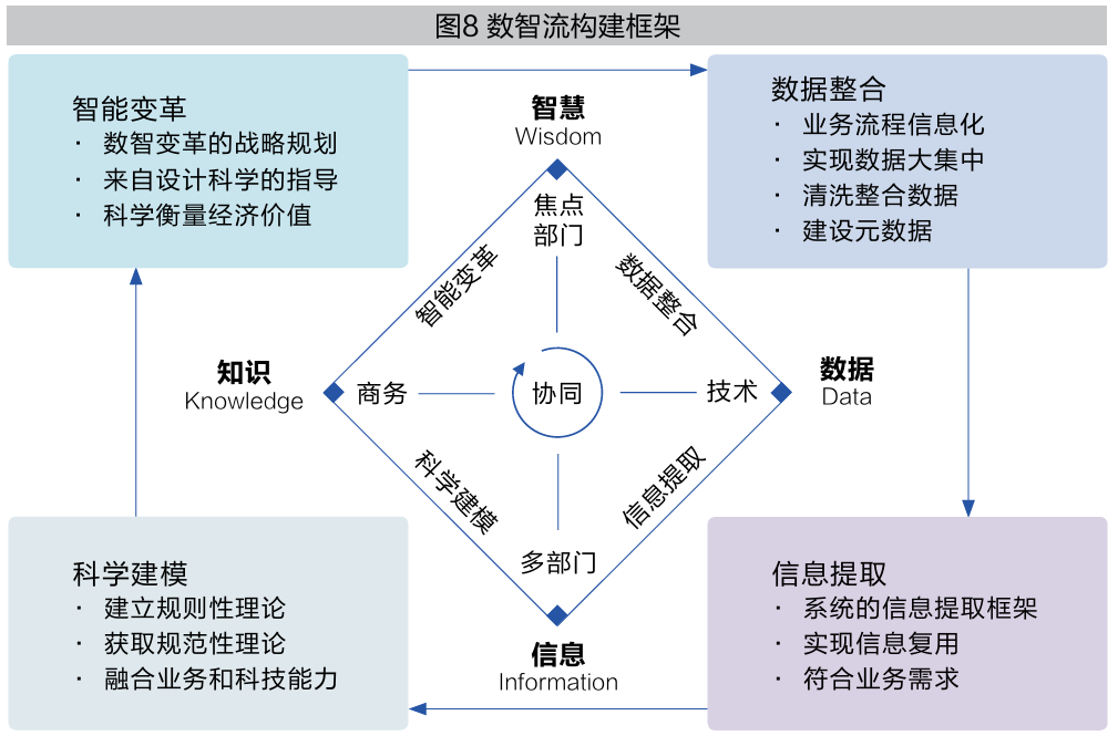 如何构建数智流?在已有研究成果的基础上,本文提出了一个数智流的构建框架(见图8)。首先,企业要从管理层面变革组织管理方式,将数据变革作为公司整体战略的重要组成部分。其次,从原始数据跃迁至数据智能,实现企业数据资产化,释放数据价值,需要焦点部门及多个部门协同发力。最后,在构建数智流的过程中,管理理论与实践、技术与业务模式应当协同发展。数智流的构建并不是以“数字技术为导向”,而是将数字技术与业务模式紧密结合,以推动业务增长、再造核心业务模式作为数字战略的核心目标。