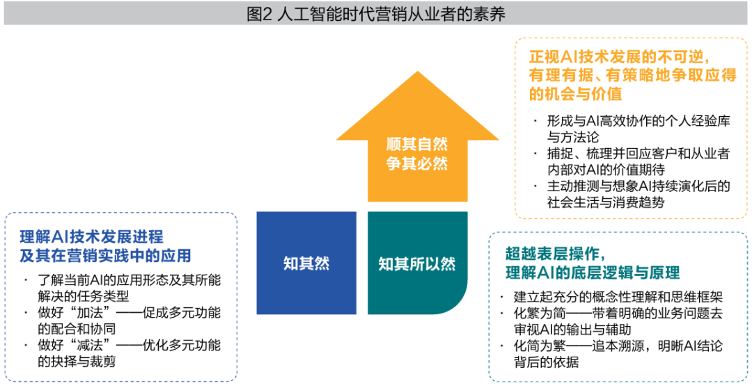 在时代车轮滚滚向前时,中国传统哲学总是能给予我们诸多启发。面对人工智能,营销从业者不妨将道家“无为而治”与儒家“积极入世”的智慧相融合,在“顺其自然”与“争其必然”的统一中应对时代变革。“顺其自然”并非消极对待,而是强调尊重客观规律、顺应时势变化;“争其必然”则主张在认清趋势的基础上,主动争取应得的机会与价值。我们认为,二者共同构成了营销从业者在AI时代应有的认知与行为范式。对于营销人而言,“顺其自然”是心态,是对技术发展规律的好奇、尊重与接纳;“争其必然”是行动,是对职业价值的主动塑造与捍卫。只有顺应AI时代之“自然”,才能找准和把握AI时代之“必然”;只有全力争取“必然”,才能真正融入“自然”。