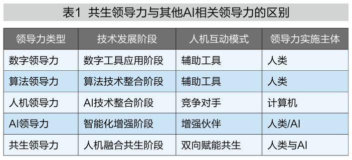 除共生领导力之外,工作场所中也涌现出其他AI相关的领导力,包括数字领导力、算法领导力、人机领导力、AI领导力,它们均反映了数字技术与领导职能的交互,但也存在诸多不同。首先,数字技术发展阶段不同。上述领导力的涌现基本遵循数字技术在组织中的发展过程,如数字领导力产生于“数字工具应用阶段”;算法领导力与人机领导力产生于“数字技术整合阶段”;AI领导力产生于“智能化增强阶段”;共生领导力产生于“人机融合共生阶段”。其次,人机互动模式不同。在不同类型的领导力中,数字技术与人类领导者的互动经历了由“辅助工具”到“竞争对手”再到“增强伙伴”的演变。然而,这些互动模式本质上仍是AI对人类领导者的单向赋能;相比之下,共生领导力强调AI领导者与人类领导者双向赋能的共生模式。最后,领导力实施主体不同。相较于其他以人类或数字技术为单一主体的领导力类型,共生领导力突出“人-AI双主体”视角,强调人类领导者与AI领导者共同承担领导职能,充分发挥二者的优势(见表1)。
