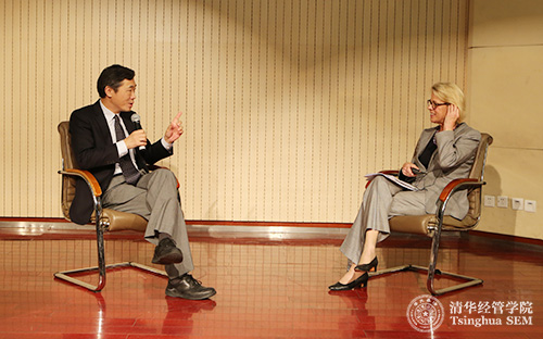 清华经管学院弗里曼讲席教授、清华大学中国与世界经济研究中心主任、金融系李稻葵教授(左)与玛莎·万德伯格博士就现实问题进行对话