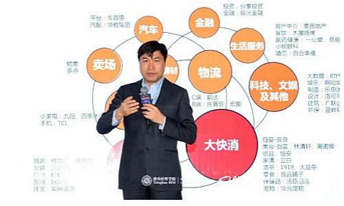 随后,高红冰介绍了项目首期班的学员情况及课程体系。52位学员企业资产总额超5000亿人民币,并具有广泛的行业代表性,横跨12个大行业;学员均为企业实际控制人,超四成为“80后”,实现跨界学习、跨代学习、跨产业链学习。项目独创“三方共创”模式,其中清华经管学院负责理论研究,阿里巴巴集团提供创新思维和案例,学员企业提供企业实战案例,三方共同研究学员企业实战案例,打造课堂案例和行业标杆。