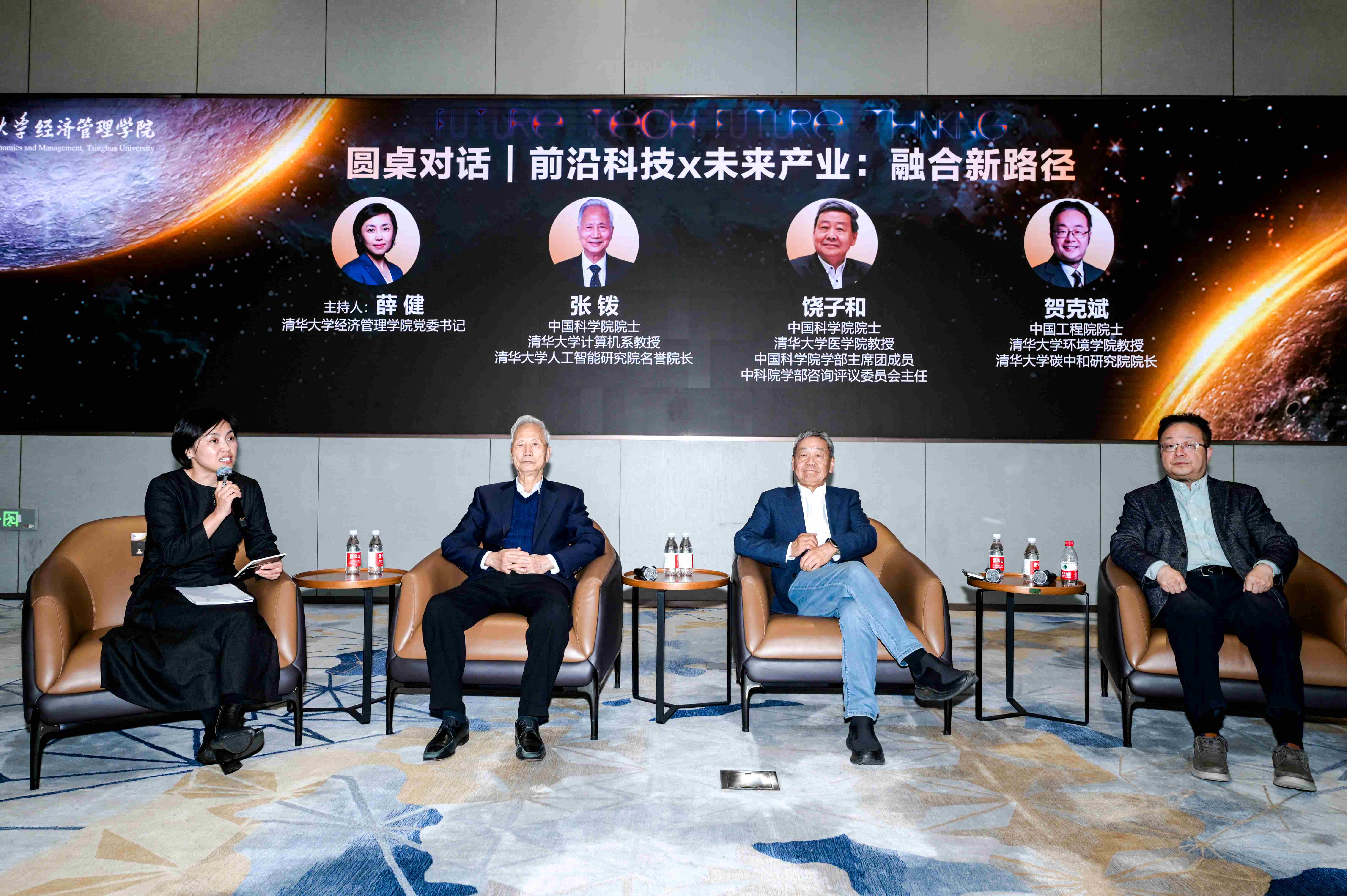 圆桌论坛环节,薛健与张钹、饶子和、贺克斌共同围绕“前沿科技X未来产业:融合新路径”展开精彩对话。张钹阐释了人工智能技术产业化面临的核心挑战与路径。他指出,技术驱动的企业面临开辟新市场的难题,而应用驱动的企业则受困于技术门槛低导致的同质化竞争。他特别强调,中小企业应避免独立进行前沿研发,而需借助成熟技术与外部合作来开发产品,以应对创新源头不足的长期风险。饶子和深入辨析了生物医药研究的产业逻辑。他强调,传染病防治更具公共产品属性,需依靠国家与社会力量;而慢性病治疗则拥有更明确的商业前景。他呼吁基础研究应保持前瞻性,并通过与产业结合,将科学发现转化为切实的疾病解决方案。贺克斌系统阐述了绿色技术发展的双引擎——“法规标准”与“市场碳价”。他预判了技术机遇的时间表:近期(三、五年)关注氢能、建筑光伏与碳市场;远期则着眼于可控核聚变等变革性能源技术。他建议企业家将技术研发与未来碳资产价值紧密结合。