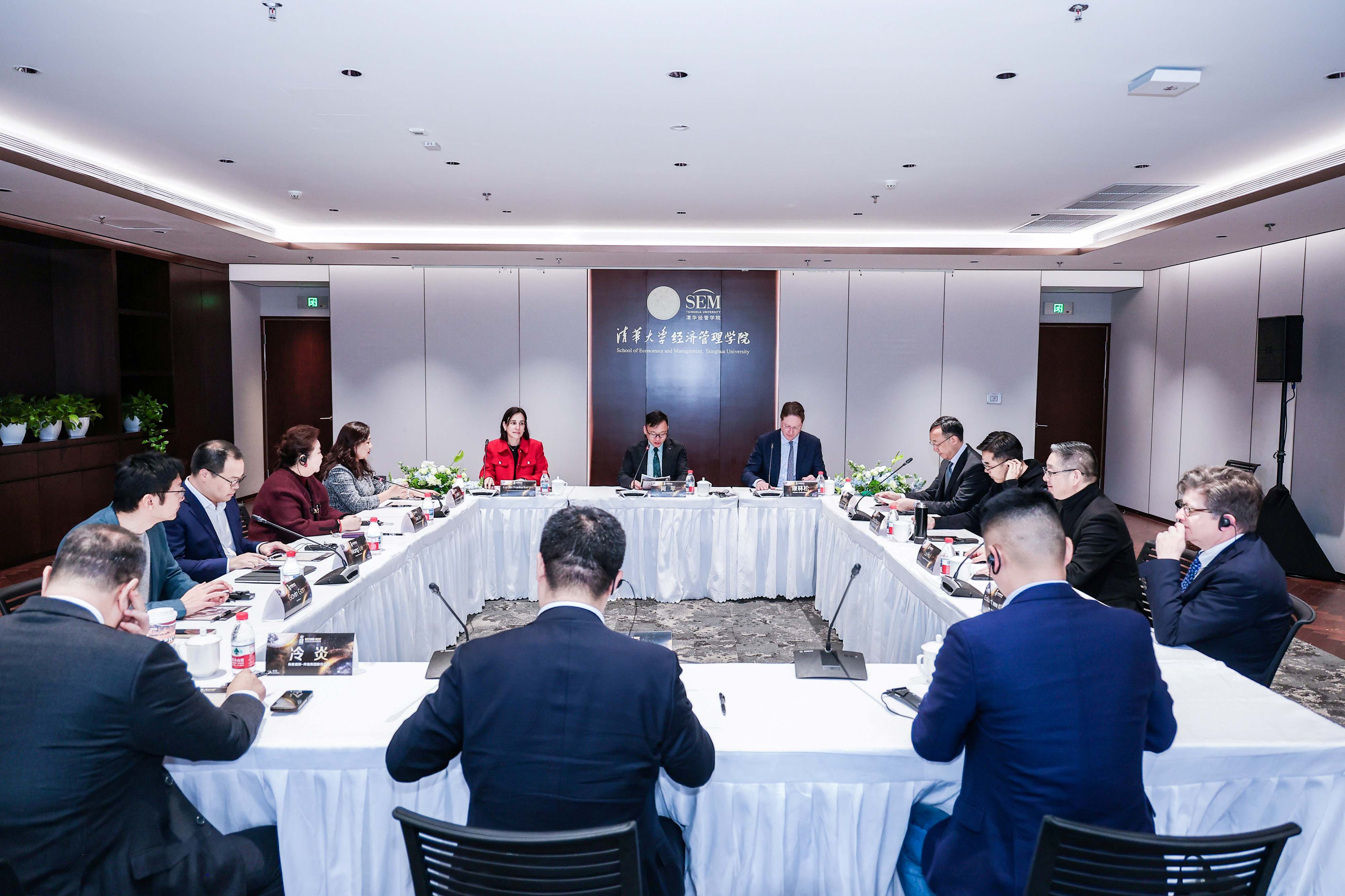 2026年3月21日,清华经管知行·未来科技“新质领航 聚力同行:全球卓越企业的发展与破局之路”座谈会在建华楼举行。清华经管学院院长白重恩、梅赛德斯-奔驰集团股份公司董事会主席康林松、圣加伦大学高管学院院长卡罗琳·弗兰肯伯格(Karolin Frankenberger)、清华经管EMBA教育中心主任庄丽、梅赛德斯-奔驰集团股份公司首席战略官高旭等出席,并与多位校友围绕品牌建设、传统产业数字化变革、企业全球化发展三大核心议题展开深度研讨,共话全球新格局下企业的增长新路径。活动由清华经管学院副院长何平主持。