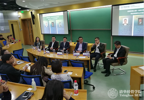 2017年4月19日,清华经管学院职业发展中心举办以“金融转型之路—MBA学生转型金融的思考”为主题的行业定向活动。本次活动邀请多位金融业嘉宾及校友参加,包括神州伯乐管理咨询有限公司合伙人肖美珍女士,银河金汇证券资产管理有限公司权益及量化投资部总经理杨喆(MBA2005),清华x-空间(清华x-lab)创业DNA基金管理合伙人、清华经管学院中国创业研究中心新三板实验室执行主任戴永(MBA2006),联想之星投资管理有限公司投资董事王一(MBA2011),第一创业证券河北分公司业务一部项目经理武万里(MBA2016)。