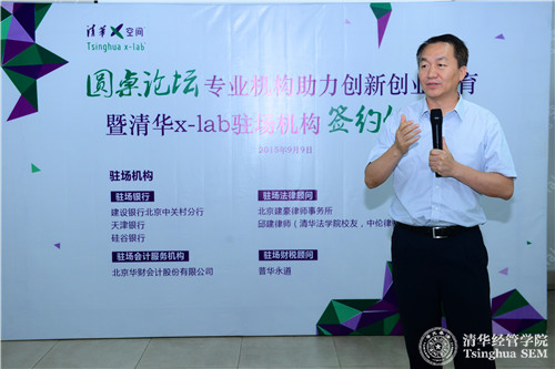 2015年9月9日,清华x-lab(清华x-空间,清华大学创意创新创业教育平台)举办“专业机构助力高校创新创业教育”圆桌论坛暨清华x-lab驻场机构签约仪式。建设银行北京中关村分行、天津银行、硅谷银行、普华永道、北京华财会计股份有限公司、北京建豪律师事务所、邱建(清华大学法学院校友,中伦律师事务所合伙人)七家机构和个人正式入驻清华x-lab场地,这是高校双创教育引入专业机构驻校服务的首次尝试。清华大学经济管理学院党委书记、创新创业与战略系高建教授,七家驻场机构代表,清华x-lab在培育项目团队代表等参加了此次活动。活动由清华x-lab执行主任毛东辉主持。