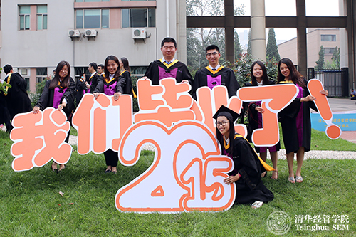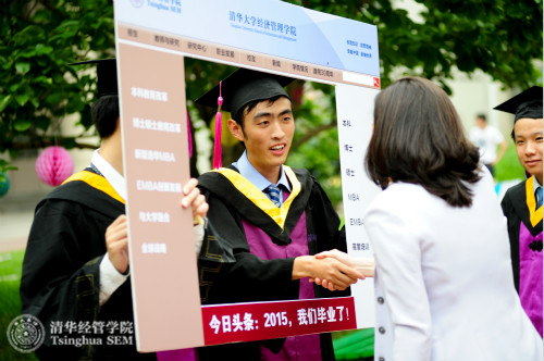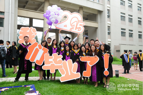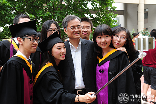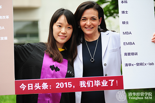 2015年6月27日中午,清华大学经济管理学院2015年毕业招待会在学院伟伦楼、舜德楼和庭院举行。近千名毕业生及其亲友到场,并与老师们一起欢聚庆贺。此次毕业典礼的演讲嘉宾,Facebook公司首席运营官谢丽尔•桑德伯格(Sheryl Sandberg)女士也被现场的热烈氛围所感染,并与现场的毕业生亲切交谈、合影留念。