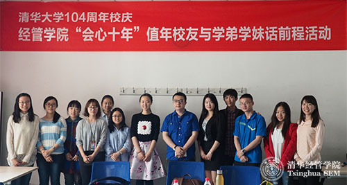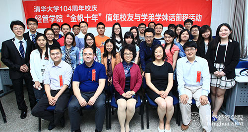 2015年4月25日下午,清华大学104周年校庆“启航人生:清华经管学院值年校友与学弟学妹话前程”系列座谈会举行。此次活动由清华经管学院校友办、学院团委、以及四个学生协会(金融协会、经济学会、信管协会、会计协会)共同组织,学院经1985级、经1995级和经2001级的9位校友重返校园,通过问答形式与学弟学妹们进行交流,分享了自己的学习与工作经历,共话前程未来。