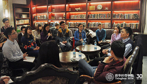 2014年12月9日晚,清华大学经济管理学院金融硕士校友协会(MoF Club)行业导师系列分享会第一场暨投行专场在伟伦楼415举办。中国国际金融有限公司董事总经理兼并购组负责人王子龙(经1995)、清华经管学院金融硕士学术主任刘淳教授、硕士项目办公室执行主任张亦萌老师以及部分2013级和2014级金融硕士项目学生参加了这次分享会。分享会由2014级MoF Club成员李沐青同学主持。