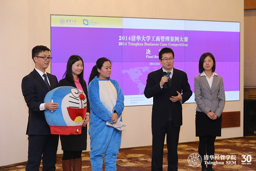 第一支出场的团队是由经管学院全球MBA和法学院法律硕士学生组成的纯留学生团队“Tsinghua Global”。他们用英文演讲和故事性的生动阐述,深深吸引了全场的评委和观众。在接下来的比赛中,各参赛团队使出浑身解数,或协同配合,或思想交锋,或反复博弈。所有学生都全力以赴,竞争十分激烈。来自经管学院在职MBA项目的团队“三言两语队”为案例企业提出了非常有建设性的建议,还带来了为案例企业建议的卡通机器猫。在评委问答环节,他们的旁征博引、妙语连珠,引来场下阵阵掌声。来自新加坡、美国、新西兰的一支交换生团队,表现也非常出众。其中一位主讲Diana同学努力用中文来阐述案例报告,中英文双语的PPT也制作精美,博来评委的阵阵好评。