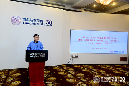 2014年9月3日下午,清华大学经济管理学院2014级硕士研究生开学典礼在舜德楼418举行。会计硕士学术主任罗玫教授、金融硕士学术主任刘淳教授、管理硕士学术主任迟巍教授与两百多名2014级硕士研究生新生参加了开学典礼。清华经管学院副院长郦金梁教授,金融系何平教授、王浩教授、高峰教授,创新创业与战略系李东红教授出席开学典礼。开学典礼由罗玫教授主持。