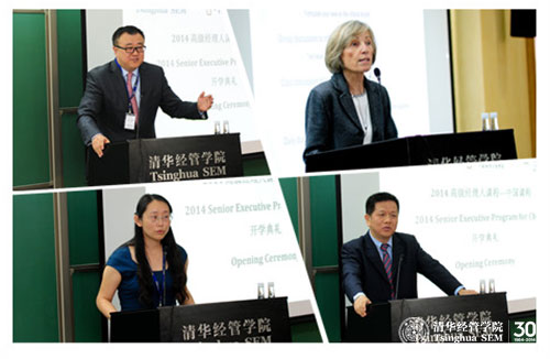 课程开学仪式于2014年8月11日下午在清华经管学院举行。清华大学校长助理、研究生院院长杨斌教授,中欧国际工商学院周东生教授,哈佛商学院高级副院长、教授发展部主任林恩•佩因(Lynn Sharp Paine)教授,清华经管学院会计系主任肖星教授,清华经管学院高管培训中心主任薛镭教授出席了开学仪式。