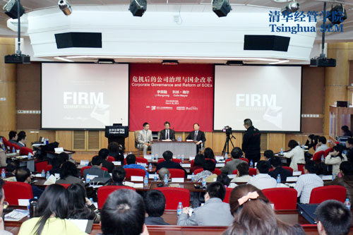 2013年3月28日,危机后的公司治理与国企改革论坛在清华经管学院举行。全国政协经济委员会副主任、清华大学经济管理学院兼职教授、国务院国有资产监督管理委员会首任主任李荣融与牛津大学金融学教授Colin Mayer从企业运营和监管的角度与200余位来自企业和学界的代表共同探讨了危机后的公司治理和国企改革。论坛由清华经管学院金融系黄张凯教授主持,清华大学经济管理学院公司治理研究中心副主任王琨,清华经管学院高管培训中心常务副主任刘燕欣出席了此次活动。