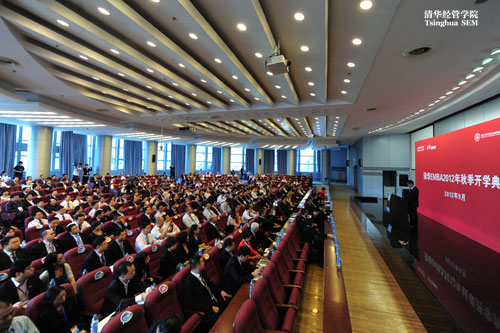 9月19日下午,清华EMBA2012年秋季开学典礼在清华大学主楼后厅举行。典礼首次由清华经管学院与清华五道口金融学院共同举办,来自2012级清华经管学院EMBA、第八期清华—花旗EMBA媒体班、以及首届五道口金融EMBA的400多位同学参加了开学典礼。清华大学经济管理学院院长钱颖一、院长助理狄瑞鹏,清华大学五道口金融学院常务副院长廖理、党委副书记赵岑等参加了典礼。