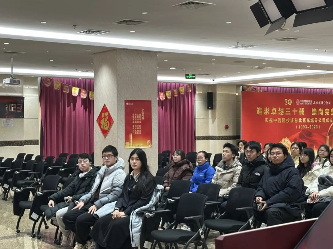 2025年11月27日下午,由辅导员章佳驰、赵宇轩、刘鉴锋带队,30余名学院本科生赴中信建投证券北京东城分公司及京信学堂开展实践活动,探索“金融服务实体经济”的实践路径。
