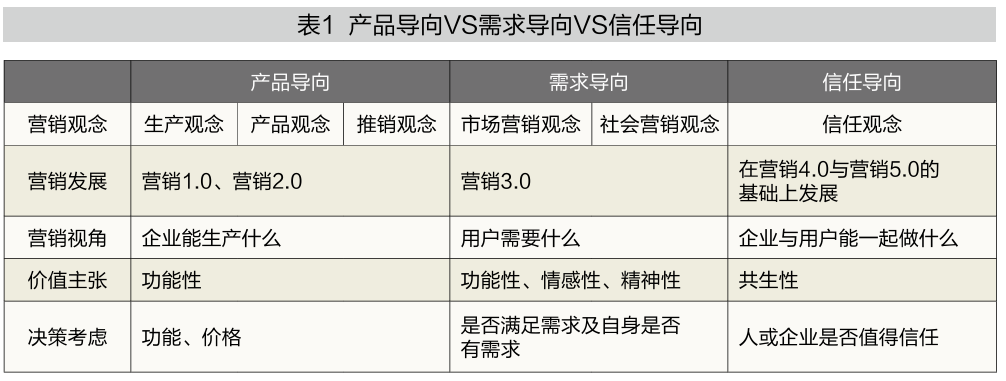 在产品导向时期,人们购买产品主要考虑产品的功能价值、价格高低;在需求导向时期,人们主要考虑是否满足需求以及自身是否有需求。数智时代,在产品同质化、信息透明化、营销内容化的环境变化中,营销导向逐渐从需求转变为信任,企业需要在与用户共生的过程中建立信任关系。用户因信任某个人而愿意为此人提供的产品服务做出购买决策。在数智营销工具的帮助下,企业就如同一个人,用户信任企业,则愿意选择企业,而无关企业的市值、规模,这也让我们意识到企业与用户之间信任关系的可贵。营销4.0与营销5.0为企业与用户进一步建立信任关系打下基础,传统的营销范式——“4P”“STP”等理论虽也是数智时代营销的必要条件,但显然无法充分满足数智时代基于信任导向的营销需要。我们认为,数智时代需要构建以信任为导向的新营销范式来指导“企业与用户能一起做什么”(见表1)。需要注意的是,即便营销导向发生了转变,传统营销范式与新营销范式也不是替代关系,而是并存关系。