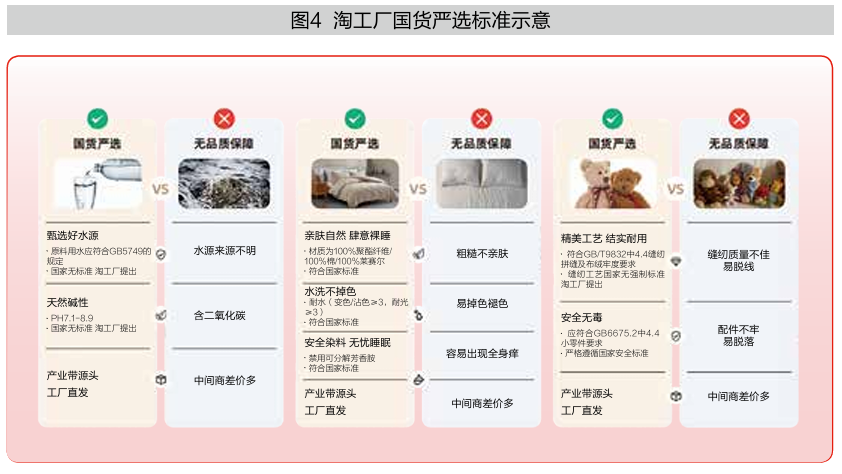 自2024年11月以来,淘工厂联合百大品牌推出了产业带品质标准,目前已覆盖150多个子类目,1万多个商品,在参与制定的主体上,淘工厂设立专门团队,由淘工厂质量安全管理团队主导,邀请行业运营和营销、品类核心品牌供应商及权威第三方机构共创完成。在标准制定过程上,依托商品适用的国家、行业等标准和法规要求,结合内外部相关品类的质量数据(例如抽检、舆情和平台消费客诉数据等),深入了解消费者对商品材质、使用性能、安全性等核心关切点,最终将其转换形成国货严选标准(见图4)。在商家入驻流程上,商家需要提供相应的品牌注册证书或者品牌授权资质证明,在进行权威审核后,会安排针对商品进行随机抽检,抽检合格,即可成为“国货严选-品质联盟” 商家。目前已有超100个商家加入淘工厂品质联盟。