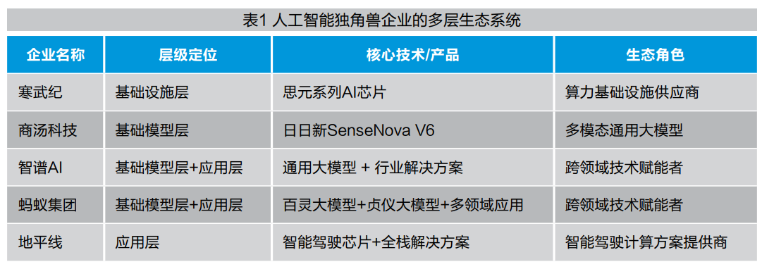 人工智能独角兽企业的多层生态系统可分为基础设施层、基础模型层和应用层。基础设施层为人工智能技术提供底层硬件、算力支持和数据服务,是整个生态的基石,寒武纪等企业提供AI芯片,Scale AI专注于数据标注服务即属于这一层。基础模型层聚焦核心人工智能技术研发,构建基础通用大模型,比如DeepSeek的大模型,智谱、商汤的多模态大模型,覆盖文本、图像和语音等多领域。应用层包括消费级应用和企业级解决方案,如蚂蚁集团在生活服务、医疗健康、金融服务、智能终端领域的应用,地平线科技的自动驾驶,智元的机器人等(见表1)。