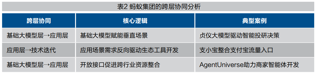 比如,蚂蚁集团依托百灵多模态大模型和贞仪金融场景大模型,构建跨模态理解与决策能力,支持合同秒级解析与智能投研决策,显著提升金融机构效率,并通过应用层需求反向驱动技术迭代,实现垂直生态渗透。在金融服务领域,AI金融管家“蚂小财”连接200家机构,将专业理财服务下沉至三线以下城市,45%用户来自下沉市场,体现普惠金融与技术普惠的双向协同。可信AI技术将支付宝资损率控制在亿分之一以下,形成基础大模型层与应用层的闭环反馈。为了进一步推进基础大模型层和应用层之间的紧密协同,推动生态伙伴共创价值,蚂蚁推出AgentUniverse智能体开发平台,开放API接口,支持零代码创建智能体并一键发布至支付宝生态,打通支付、搜索等20余项工具,降低开发者接入门槛,实现对医疗、政务等行业或领域的资源整合和场景智能化升级(见表2)。