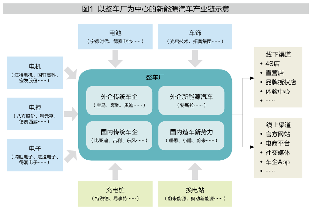作为一个典型的技术驱动型产业,新能源汽车产业链极其复杂,从钴、锂、镍等关键原材料的供应到最终产品的生产、销售和服务,形成了一个以整车厂为核心,链接电机、电控、电子、电池等多行业的复杂生态系统(见图1)。特别是,作为传统能源汽车的替代品,新能源汽车中与电池相关的子产业(包括电池的生产、充电桩、补能服务等)对该行业的运营效率、顾客选择行为等都有关键性影响。