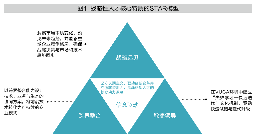 为实现上述价值,战略型人才需具备以下四大核心特质(STAR模型,见图1):战略远见(Strategic Foresight)——洞察市场本质变化,预见未来趋势,并能够重塑企业竞争格局;跨界整合(Transboundary Integration)——“技术架构×商业逻辑×组织行为”的交叉建模能力; 敏捷领导(Agile Leadership)——在VUCA环境中建立“失败学习—快速迭代”文化机制;信念驱动(Resilient Beliefs)——坚守长期主义,驱动创新变革并克服转型阻力。