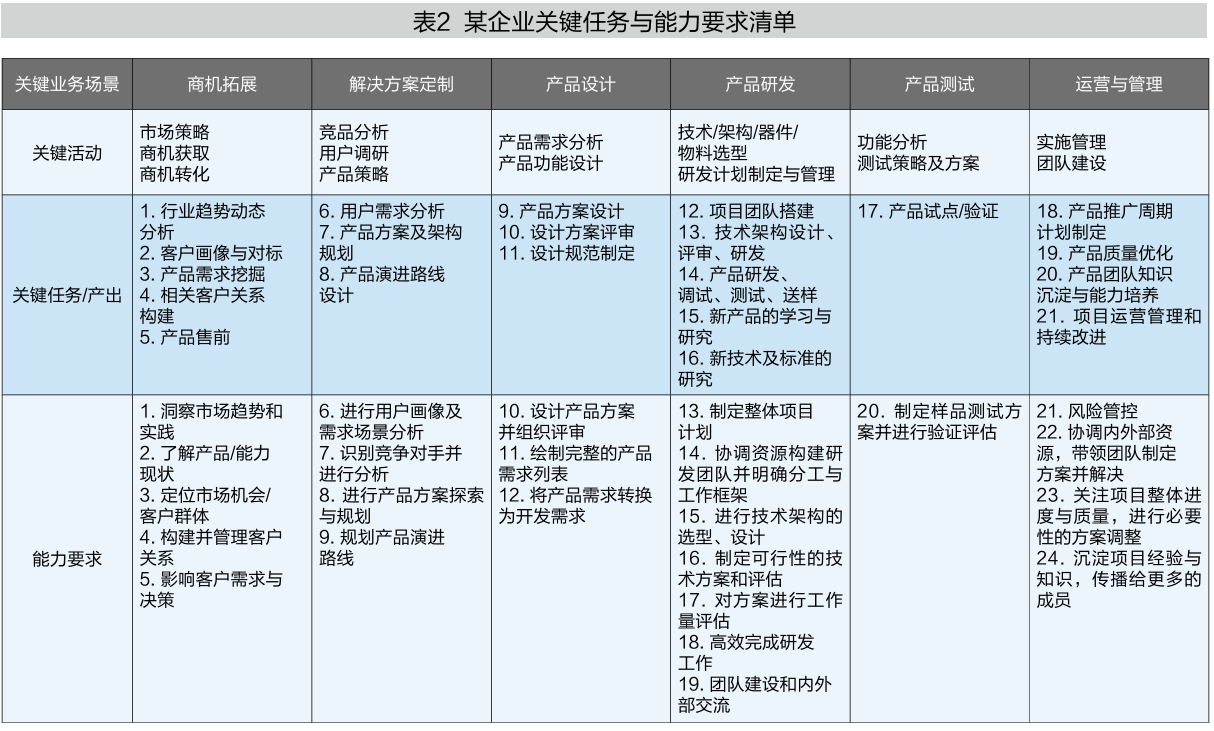 企业战略是人才能力需求的导向标。通过利益相关方访谈、战略与商业模式分析,将企业战略目标分解为具体的业务任务,并识别数智化转型中的关键能力需求。例如,某科技公司通过多方干系人访谈与市场数据分析,形成了 “关键任务与能力要求清单”,明确市场洞察、产品策略、跨界合作等核心能力标准,为后续人才管理提供战略依据(见表2)。此阶段的产出聚焦于战略对齐,确保顶层设计与业务目标的一致性。