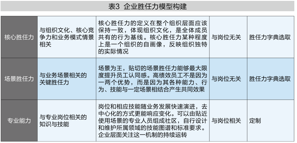 基于岗位画像与战略需求,企业需构建适配的胜任力模型。在构建胜任力模型时,企业应结合本企业的组织文化和核心竞争力来构建符合组织战略的人才胜任力(见表3)。
