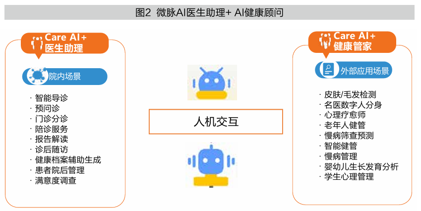 目前,“CareAI+多师共管”的模式已在与微脉携手合作的多家医院中成功落地,并稳步推广。例如,作为国内最早引入微脉CareAI大模型的公立医院,台州恩泽医疗中心(集团)很早就意识到医患信任薄弱化是当前“AI+医疗健康服务”面临的一大痛点,而AI与人合作的方式恰恰可以通过提升医疗服务质量、延伸医疗服务边界、满足患者个性化需求来强化医患信任。因此,台州恩泽医疗中心与微脉携手,以“AI医生助理+ AI健康顾问”(如图2所示)的方式来加强患者对医疗大模型的信任。