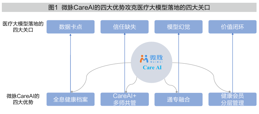 得益于多年来在“AI+医疗健康”领域的积累,微脉CareAI凭借全息健康档案、CareAI+多师共管、通专融合以及健康会员分层管理等四大优势,试图攻破医疗大模型落地的四大关口(见图1)。CareAI的应用为用户提供从疾病预防到康复的全链条服务、为公立医院创造广阔的增量服务价值的同时,凭借其国内首创的“以健康会员为载体的延续性医疗服务模式”实现了经济效益与社会效益的双重提升。