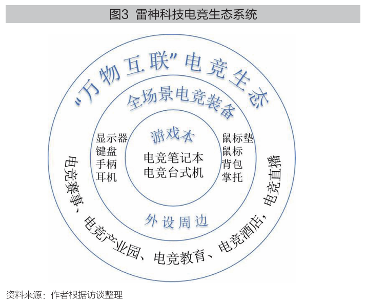 路凯林大受启发,他急忙召开会议,与几位核心创始人讨论雷神的发展方向。回顾雷神的发展历程,雷神的立身之本在于“为游戏而生”,路凯林意识到:“游戏市场在中国的规模有1200亿,但如果只说硬件市场,可能不到100亿。”雷神要继续坚守本心,挖掘消费者的“终身价值”,为消费者提供一站式电竞服务。目前雷神已经做到了第一步,为电竞爱好者提供高品质的电竞笔记本和台式机。接下来的第二步,雷神要为消费者和粉丝提供全场景的电竞装备和外设周边,进一步提高电竞体验、提高粉丝黏性。第三步,雷神将不再局限于笔记本行业,而是与体育界、教育界、媒体界等开展跨界合作,向图3所示的生态蓝图发展。