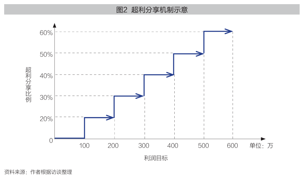 为激励“一路三李”持续创业,“三自”首先为其设置了创业生活费+超利分享机制。也就是说,“一路三李”每人能够获得一定数额的创业基础薪酬,在此基础上,当雷神实现相应的利润目标后,团队可以获得一定比例的分红。雷神的利润越高,创业团队拿到的分红也就越多(见图2)。此外,“三自”希望雷神团队能够从员工思维转变为企业家思维,将自己视为企业的主人,与海尔风险共担、利润共享。于是现金跟投被纳入考量,毕竟“只有自己真金白银地投进去了,才会更加充满干劲”,并且,团队跟投的金额在总估值中的比重也会转换为同比例股权。