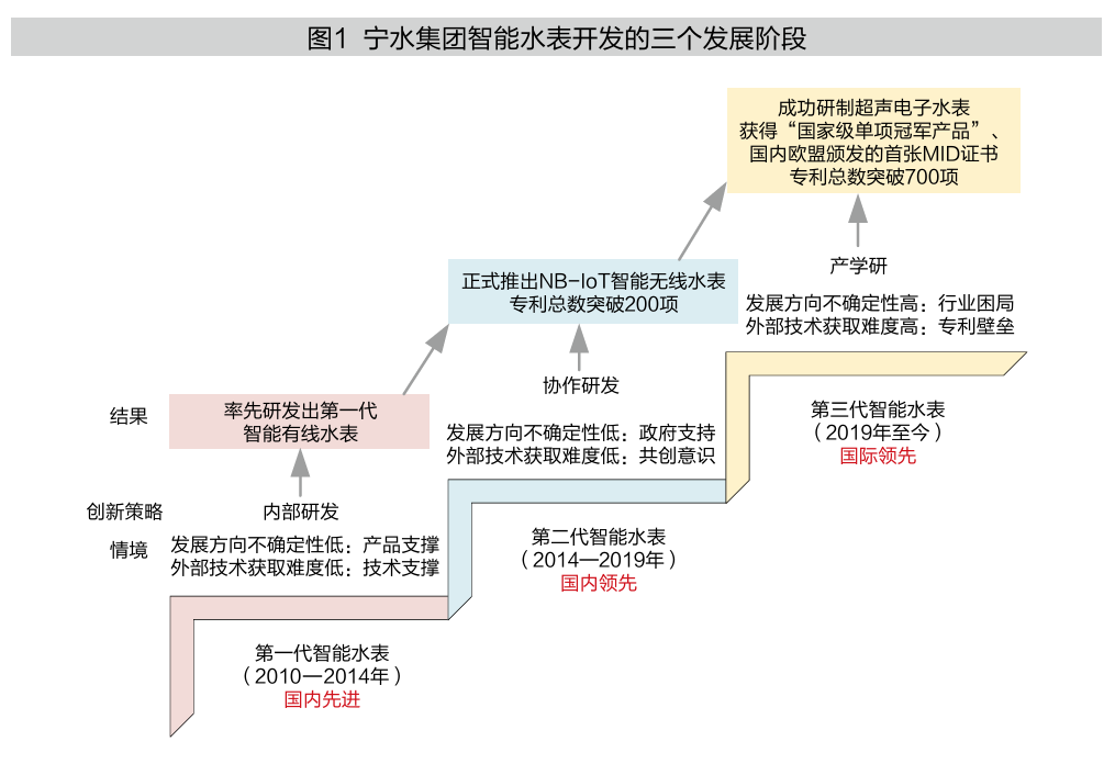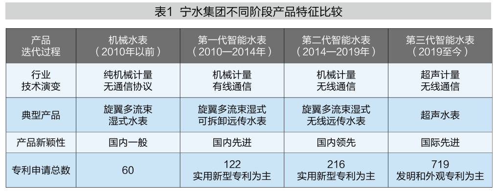 宁水集团从一家地方小厂转型为一家全国综合型大集团,其产品升级迭代下的单项冠军之路如图1所示。在不断变化的发展情景和行业需求下,宁水集团通过“内部研发-协同研发-产学研”的策略动态匹配情境,先后推出三代智能水表,行业地位从“国内先进”到“国内领先”再到“国际领先”,使得智能水表的通信协议从有线转向无线,计量原理由机械计量转向超声计量,使我国智能水表质量得到质的提升,迈入国际领先行列。三个阶段产品特征总结如表1。