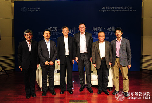 2015年10月22日晚,作为清华大学经济管理学院顾问委员会2015年会议的系列活动之一,清华管理全球论坛在清华经管学院伟伦楼报告厅举行。清华经管学院顾问委员会委员、特斯拉(Tesla)联合创始人、首席执行官兼产品架构师,SpaceX首席执行官兼首席设计师,SolarCity董事长埃隆•马斯克(Elon Musk)与清华经管学院学院院长钱颖一教授展开两小时精彩对话。论坛还邀请到清华大学物理系教授朱邦芬院士、汽车工程系欧阳明高教授、电机工程与应用电子技术系系主任曾嶸教授参与对话。清华管理全球论坛由清华经管学院副院长、弗里曼讲席教授白重恩主持。