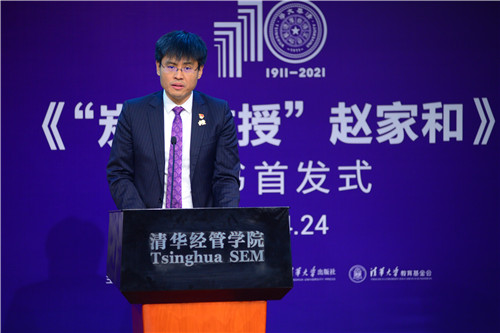 陈煜波代表本书组编单位致辞。他表示,近年来,学院党委在学院开展了包括事迹展览、事迹宣讲、公益论坛等一系列深入学习赵家和精神的教育活动,并将其作为新生入学思想政治教育的重要环节。陈煜波表示,习近平总书记4月19日在清华大学考察时强调,高等教育要心怀“国之大者”,把握大势,敢于担当,善于作为,为服务国家富强、民族复兴、人民幸福贡献力量。陈旭老师在新书序言中强调,赵家和教授是践行“自强不息,厚德载物”和“行胜于言”的典范,是传承“爱国奉献、追求卓越”清华精神的杰出代表。学院党委将认真贯彻落实好总书记重要讲话精神和学校党委的要求,以新书发布为契机,将赵家和精神作为学院立德树人、服务国家的宝贵财富和学院文化的重要组成部分,将这本新书作为党史学习教育的学习材料和新生党课的教材,引导全院师生积极传承和弘扬赵家和精神。