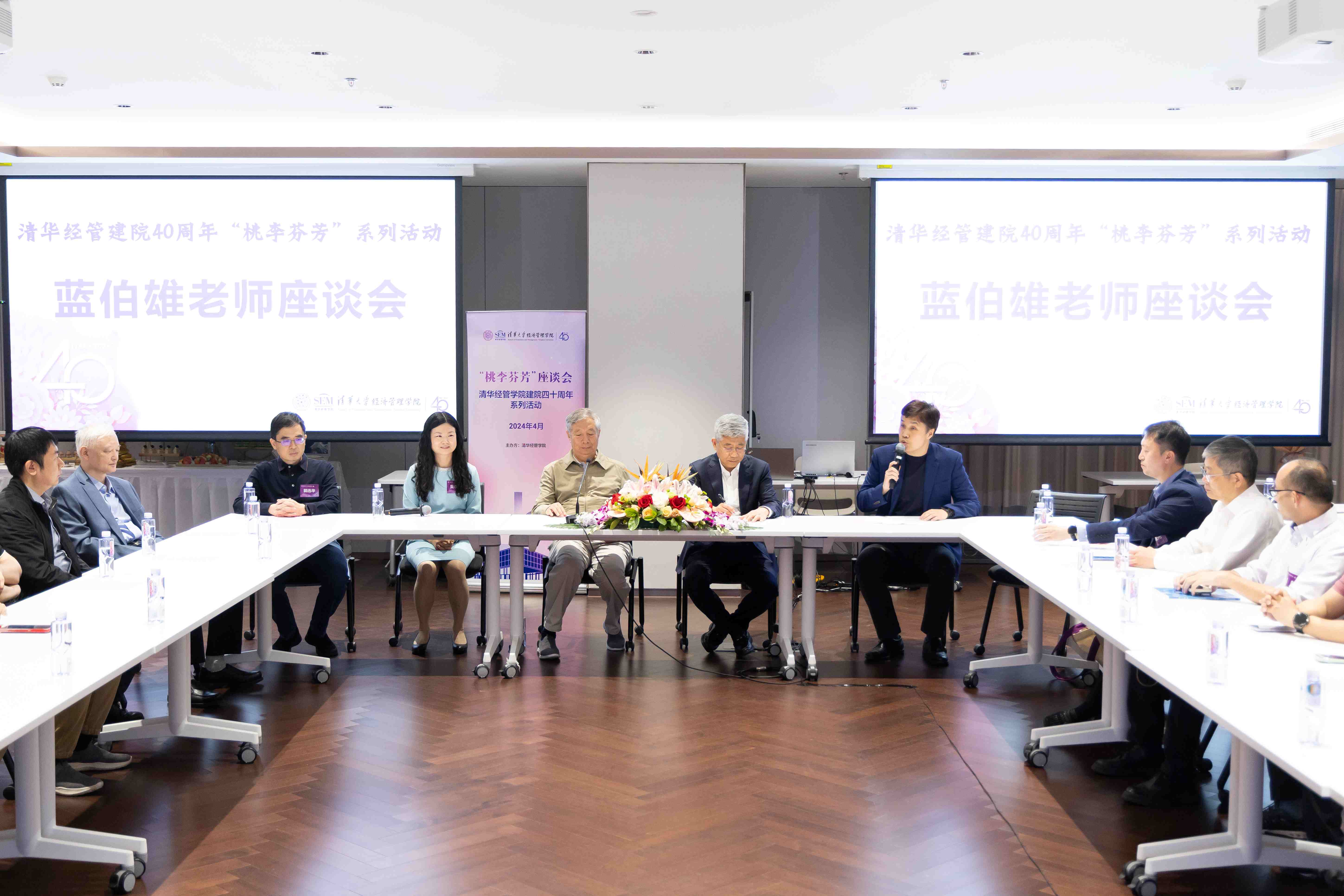 2024年4月27日,清华大学经济管理学院40周年院庆“桃李芬芳”系列活动——蓝伯雄老师师生座谈会在建华楼举行。蓝伯雄老师亲临现场,师生共忆美好时光。清华大学文科资深教授、清华经管学院院长白重恩,清华大学文科资深教授、清华经管学院管理科学与工程系教授陈国青,管科系系主任卫强,系党支部书记郭迅华,系副主任王纯等出席本次座谈会。活动由吴李知校友(经博2005)主持,来自全国各地的30余名校友参加活动。